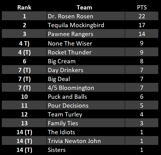 - League scoring is based on team ranking at the end of every trivia night, i.e. 8 teams are playing and you’re team finished in first place. So, your team would receive 8 points.